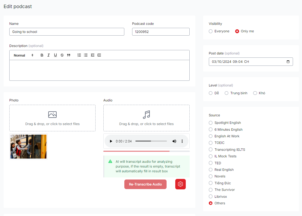 Visibility (bắt buộc): Nếu chọn "Private" thì bài nghe sẽ chỉ có một mình bạn nhìn thấy (lớp học của bạn sẽ thấy được bài nghe sau khi bạn add vào class); nếu chọn "Public" thì sau bạn submit vẫn chỉ có một mình bạn nhìn thấy cho đến khi Admin chuyển bài nghe sang dạng "Public". Recommend mọi người sử dụng "Private".