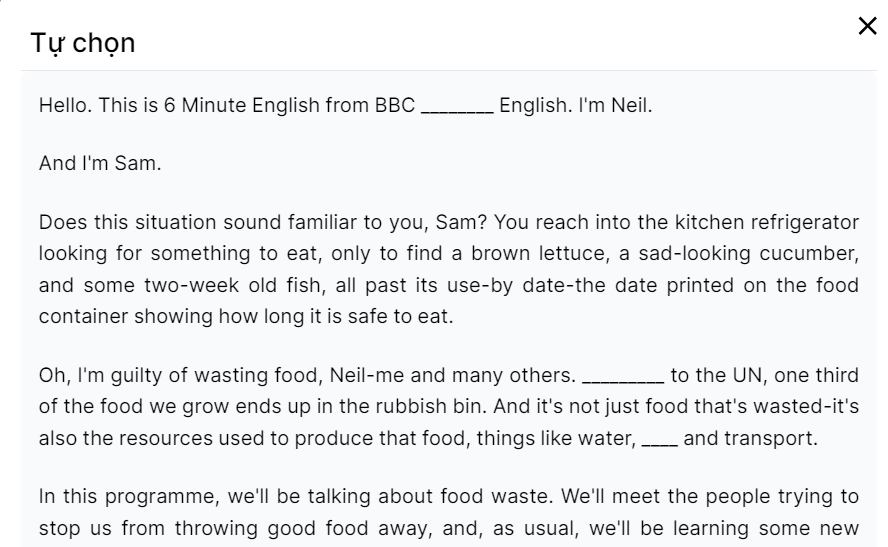 Custom là một chức năng rất mạnh, khi bạn ấn vào từ nào thì từ đó sẽ được giấu đi - và là từ mà users cần phải điền vào bài. Chức năng này giúp các thầy/cô có thể chủ động trong việc lựa chọn các từ mà thầy/cô muốn học sinh điền vào bài nghe.