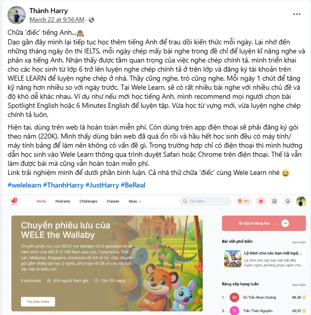 Dạo gần đây mình lại tiếp tục học thêm tiếng Anh để trau dồi kiến thức mỗi ngày. Lại nhớ đến những tháng ngày ôn thi IELTS, mỗi ngày chép mấy bài nghe trong đề chỉ để luyện kĩ năng nghe và phản xạ tiếng Anh. Nhận thấy được tầm quan trọng của việc nghe chép chính tả, mình triển khai cho các học sinh từ lớp 6 trở lên luyện nghe chép chính tả ở trên lớp và đăng ký tài khoản trên WELE LEARN để luyện nghe chép ở nhà. Thầy cũng nghe, trò cũng nghe. Mỗi ngày 1 chút để tăng kỹ năng hơn nhiều so với ngày trước. Tại Wele Learn, sẽ có rất nhiều bài nghe với nhiều chủ đề và độ khó dễ khác nhau. Ví dụ như nếu mới học tiếng Anh, mình recommend mọi người chọn bài Spotlight English hoặc 6 Minutes English để luyện tập. Vừa học từ vựng mới, vừa luyện nghe chép chính tả luôn.