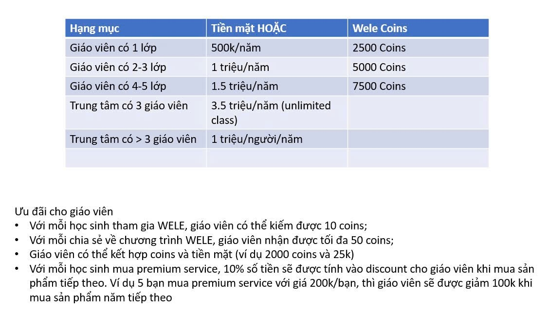 Do đó, WELE quyết định sẽ mở rộng tới tất cả các giáo viên với dự trù chi phí như sau (free lớp đầu tiên)