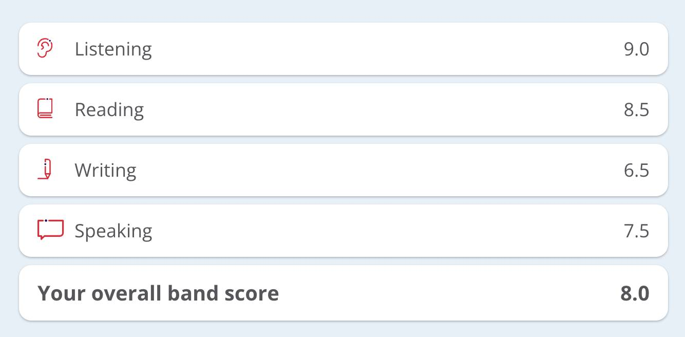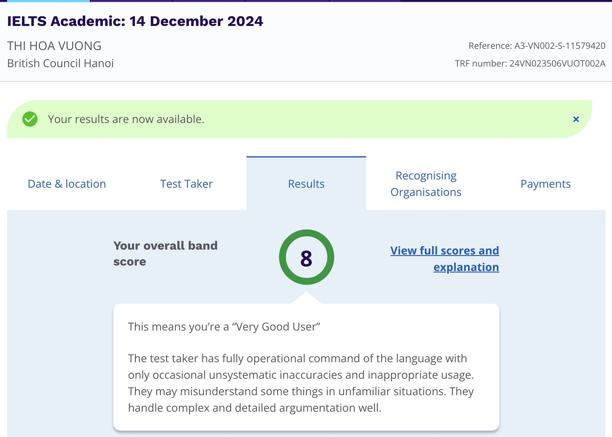 Tháng 12/2024: Mình tự học hoàn toàn, overall 8.0, kỹ năng nghe 9.0 (mình học nghe bằng nghe chép chính tả, nghe podcasts, truyện Tiếng Anh).