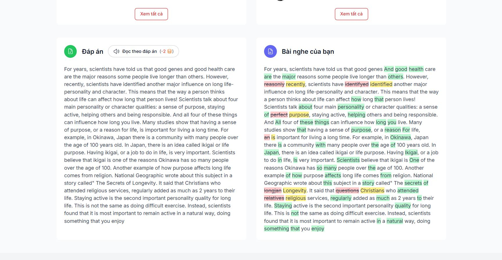 Có thể bạn sẽ nói :nó khác gì hình thức nghe chép ra giấy như mọi người hay làm. Nhưng mình khẳng định nó KHÁC, RẤT KHÁC nha. Khi bạn chép xong, muốn kiểm tra xem mình sai hay không bạn sẽ chọn "hiện ô sai" để biết mình sai ở đâu, hoặc không nghe được hết thì bạn chọn "xem từ cần điền" sẽ có 1 list các từ còn thiếu để bạn lựa chọn điền vào.