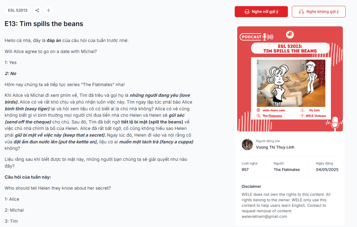 Khi bắt đầu bài nghe, bạn luôn có lựa chọn "Nghe với gợi ý" hoặc "Nghe không gợi ý". Với các bạn mới bắt đầu nghe, mình cực kỳ khuyến khích mọi người "Nghe với gợi ý" vì não của bạn chưa quen với việc vừa xử lý thông tin lớn, vừa phải điền từ vào chỗ trống. Sau một thời gian nghe với gợi ý các bạn có thể chọn nghe không gợi ý nha.