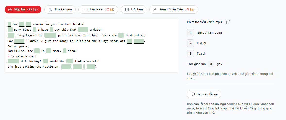 Nếu kết quả là dưới 100%, bạn có thể ấn "Hiện ô sai" để biết chỗ mình điền sai. Lưu ý là độ dài ô trống bằng đúng chiều dài từ bạn cần điền, nên nếu từ bạn điền ngắn hơn thì chắc chắn là không phải đáp án. Việc này giúp các bạn sửa lỗi sai nghe thiếu âm cuối, vốn là lỗi phổ biến ở Việt Nam.