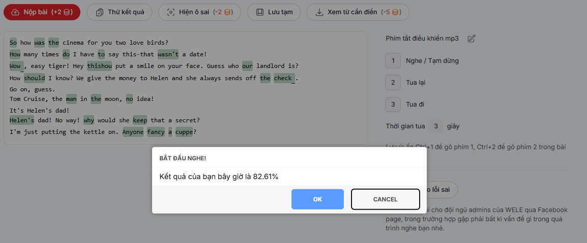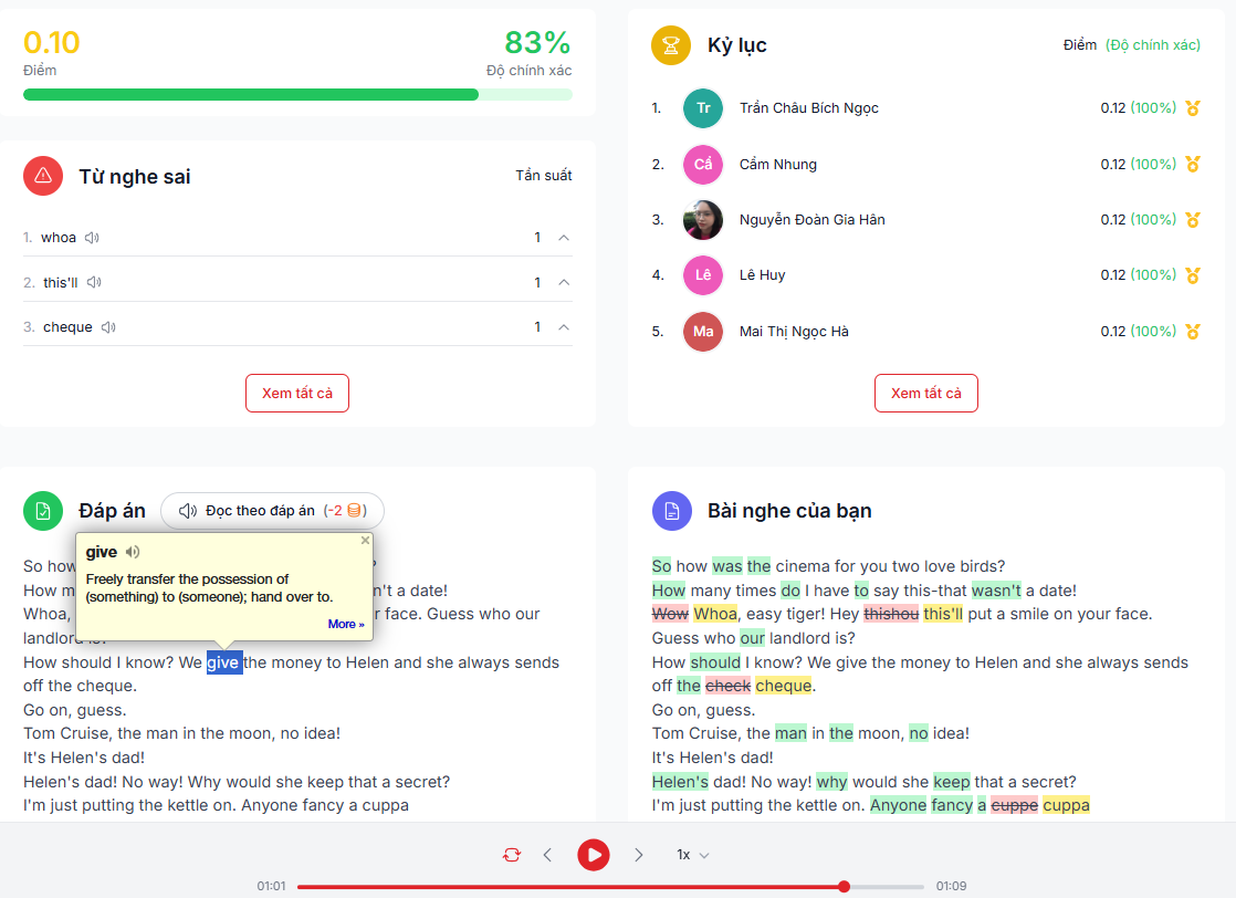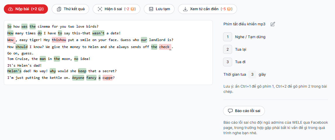 Sau khi nộp bài, bạn sẽ thấy đáp án cũng như bài nghe của bạn sẽ được chỉ ra lỗi: các từ điền đúng sẽ hiện màu xanh, các từ sai sẽ bị gạch màu đỏ và từ đúng sẽ được thêm vào màu vàng.