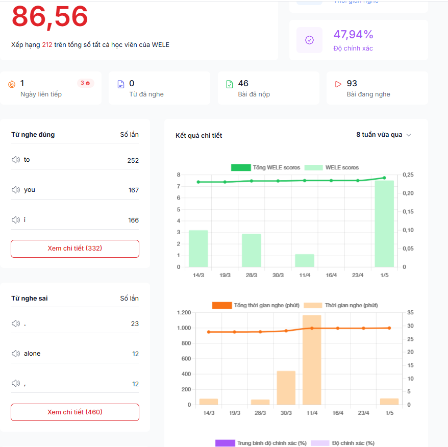 Đây là tính năng ít bạn để ý. Trong phần phân tích thành tựu mọi người có thể nhìn được số lượng thời gian cũng như số điểm của mọi người theo thời gian, các từ bạn đã nắm vững và những từ bạn thường xuyên nghe sai để nhanh chóng cải thiện.