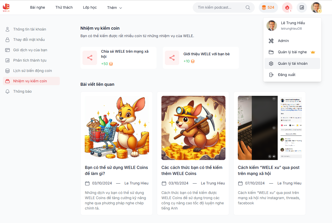 Ở trên các bạn thấy các tính năng cần sử dụng WELE coins, và các bạn có rất nhiều cách có thể kiếm Coins hoàn toàn miễn phí. Mọi người vào mục "Quản lý tài khoản" sẽ có các lựa chọn "Lịch sử biến động Coins" để xem bạn đã tích luỹ Coins như thế nào, tiêu vào việc gì, cũng như có cách cách để kiếm Coins