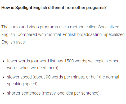 Ngoài việc miễn phí, Spotlight còn có ưu thế hơn eslpod.com ở chỗ, họ chỉ sử dụng 1500 từ để diễn giải ý, nên chỉ cần nghe khoảng 15-20 bài là bạn sẽ bắt đầu thấy các từ được lặp lại. Điều này đồng nghĩa với việc bạn chỉ cần nắm được 1500 từ là có thể tự tin nghe được tất cả các bài của spotlight.