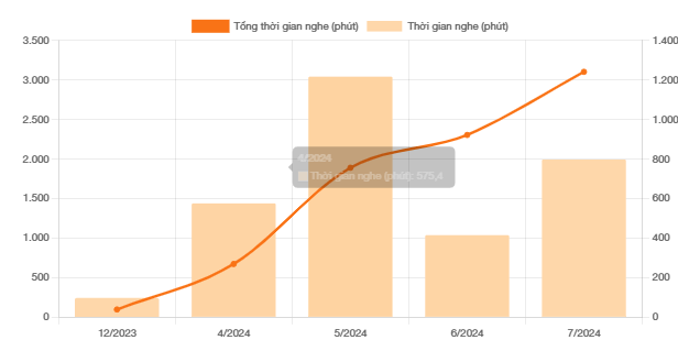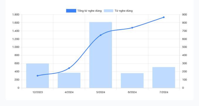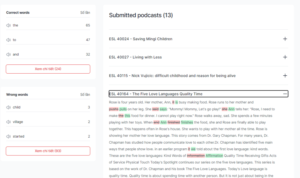 Đặc biệt, khi ấn nút báo cáo chi tiết, bạn có thể xem được cụ thể các bạn học sinh đã nghe các bài nào và đúng/sai ra sao