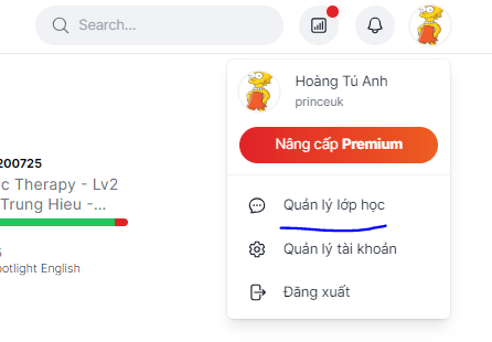 Giáo viên sẽ có 2 tính năng chính: tạo podcast và tạo lớp học. Để truy cập vào 2 tính năng này, bạn cần ấn vào profile và lựa chọn "Quản lý lớp học". Tại đây bạn sẽ có 2 tab: Podcasts và Classes