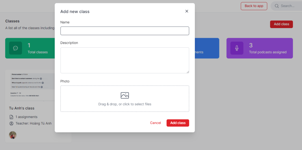 Bạn chỉ cần Add Class và điền thông tin về tên của lớp, giới thiệu cũng như hình ảnh