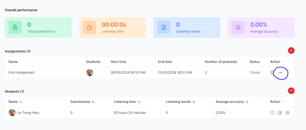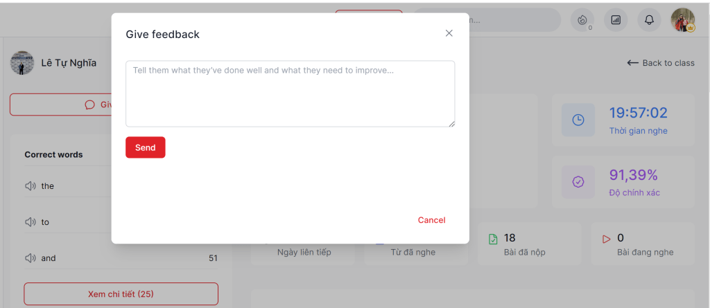 Sau khi xem các bài mà học sinh đã nghe, bạn có thể đưa ra góp ý/động viên học sinh sau mỗi tuần, học sinh sẽ nhìn thấy góp ý của bạn trên trang Class của các bạn ấy.