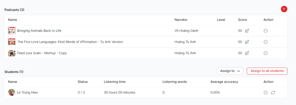 Ở trong window này, bạn có thể thêm các bài nghe (từ các bài có sẵn của WELE cũng như các bài podcasts bạn tạo ra), và bạn có thể lựa chọn assign cho từng bạn học sinh hoặc tất cả các bạn học sinh.