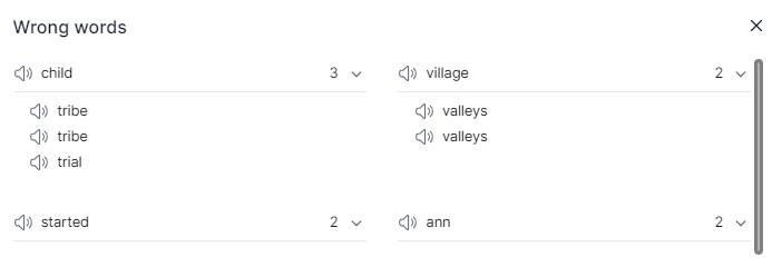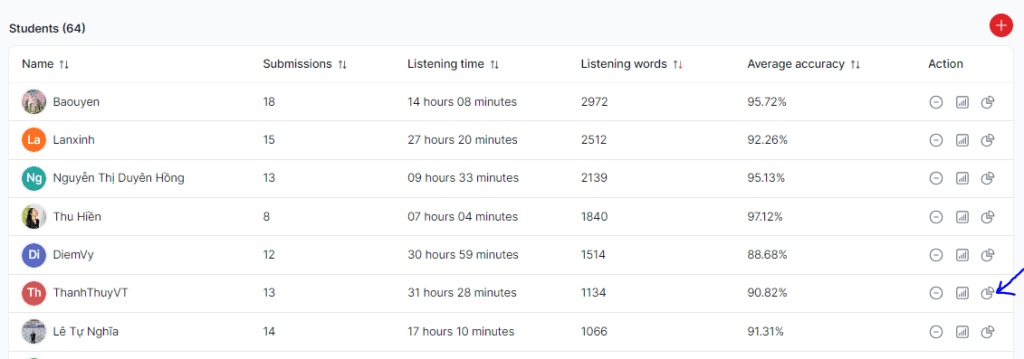Sau khi các bạn học sinh nộp bài, giáo viên sẽ biết được số lượng thời gian các bạn dành để tham gia, số lượng từ các bạn nghe được, cũng như độ chính xác.