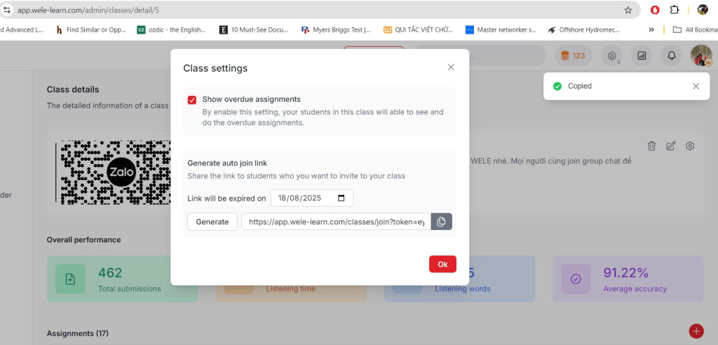 Khi ấn vào nút setting của Class, bạn có lựa chọn liệu có cho học sinh xem các bài assignment cũ của lớp hay không; cũng như tạo link để các bạn học sinh có thể join lớp một cách tự động.