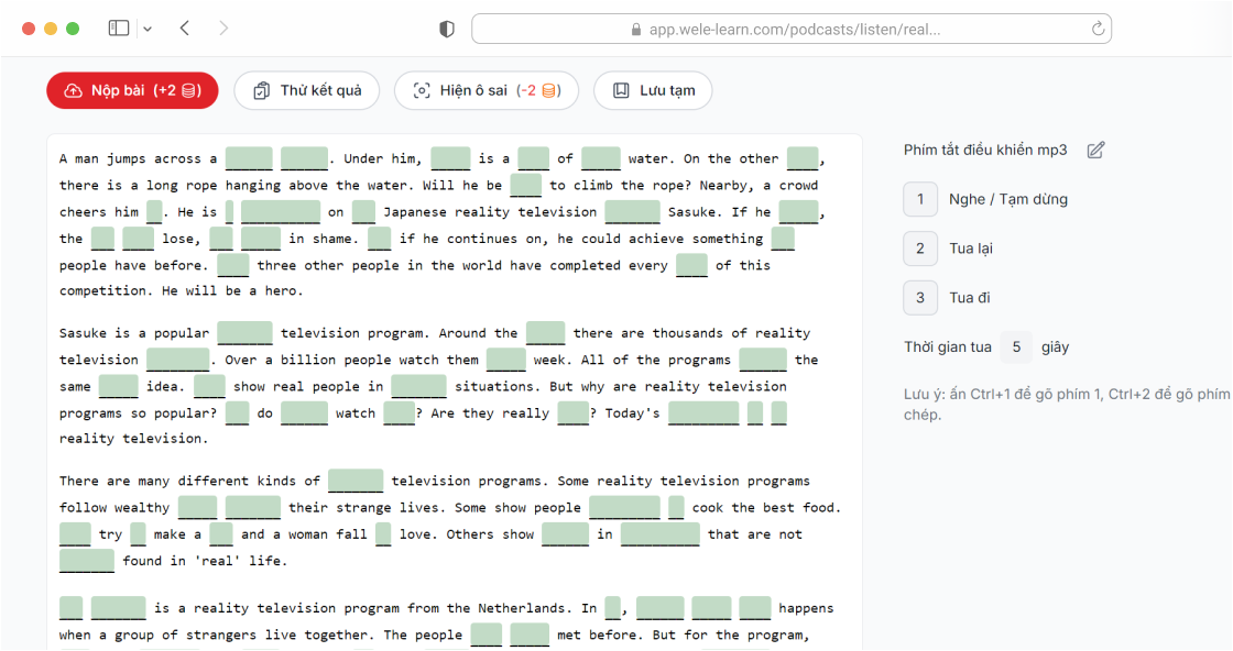 Ngay sau khi bạn nộp bài, hệ thống sẽ đưa ra kết quả, và các từ bạn nghe sai.