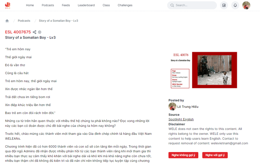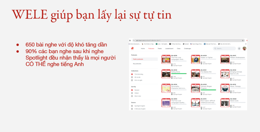 WELE có một nguồn nghe dồi dào với hơn 650 bài episodes cho các bạn lựa chọn, rất nhiều bài đính kèm lời dẫn truyền cảm hứng giúp mọi người nắm bắt được nội dung chính từ trước khi nghe, và giúp truyền động lực để mọi người hoàn thành bài nghe