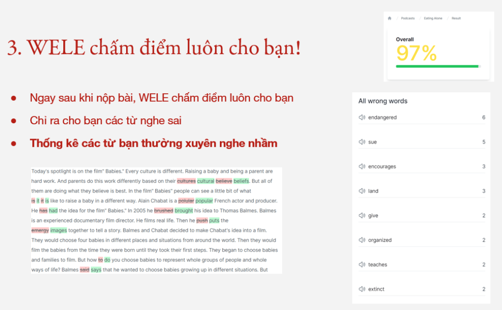3. Hệ thống chấm điểm tự động và chỉ ra cho bạn các từ bạn nghe sai